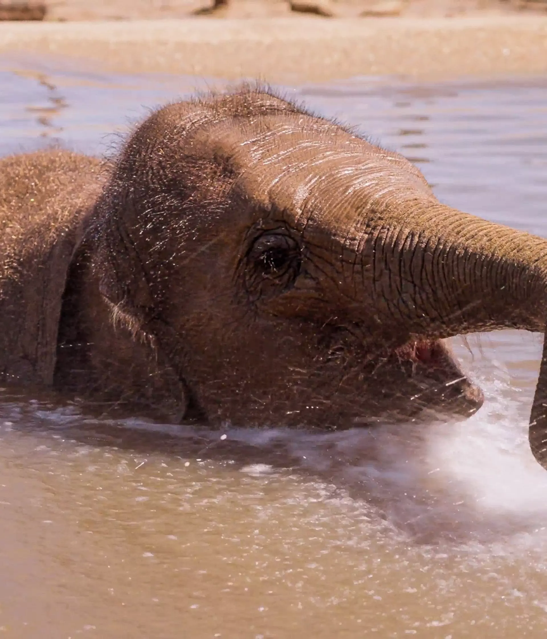 Behind-the-scenes footage shows two-year-old Nang Phaya, the herd’s youngest elephant, gleefully wading into the water, before completely submerging herself. The playful pachyderm can also be seen using her trunk to scoop gallons of water into her mouth.